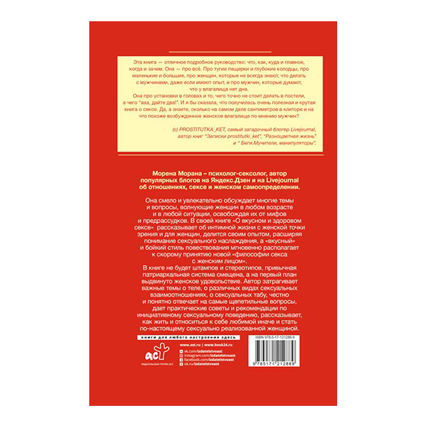 В этой книге нет места штампам и стереотипам, она полностью освобождена от патриархальной системы и на первый план выдвигает женское удовольствие. Морена Морана откровенно затрагивает важные темы о теле, о различных видах сексуальных взаимоотношений, о сексуальных табу. Она честно и понятно отвечает на самые щепетильные вопросы, дает практические советы и рекомендации по инициативному сексуальному поведению.