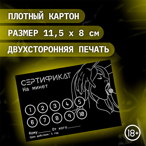 Раскройте новые возможности с набором сертификатов «Минет». В этот комплект входят пять одинаковых сертификатов из плотного картона размером 11,5 х 8 см. Каждый из них предлагает вам и вашему партнёру уникальную возможность исследовать интимные удовольствия, где азарт и страсть будут главными героями.