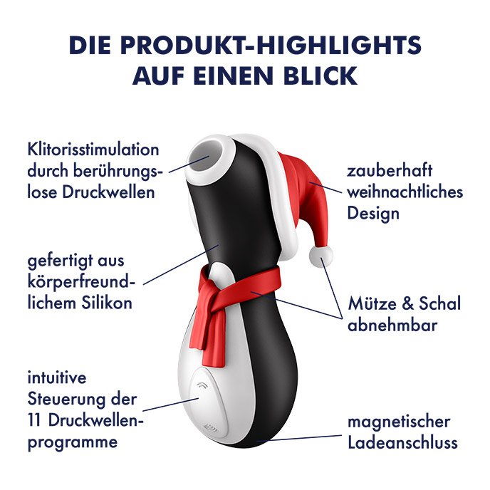 11 программ стимуляции Satisfyer Pro Penguin не дадут скучать даже при длительной эксплуатации прибора. Стрелка вниз включает и выключает прибор; также кнопками управления можно переключать режимы массажа от самого нежного и легкого до самого интенсивного и далее снова к легкому.