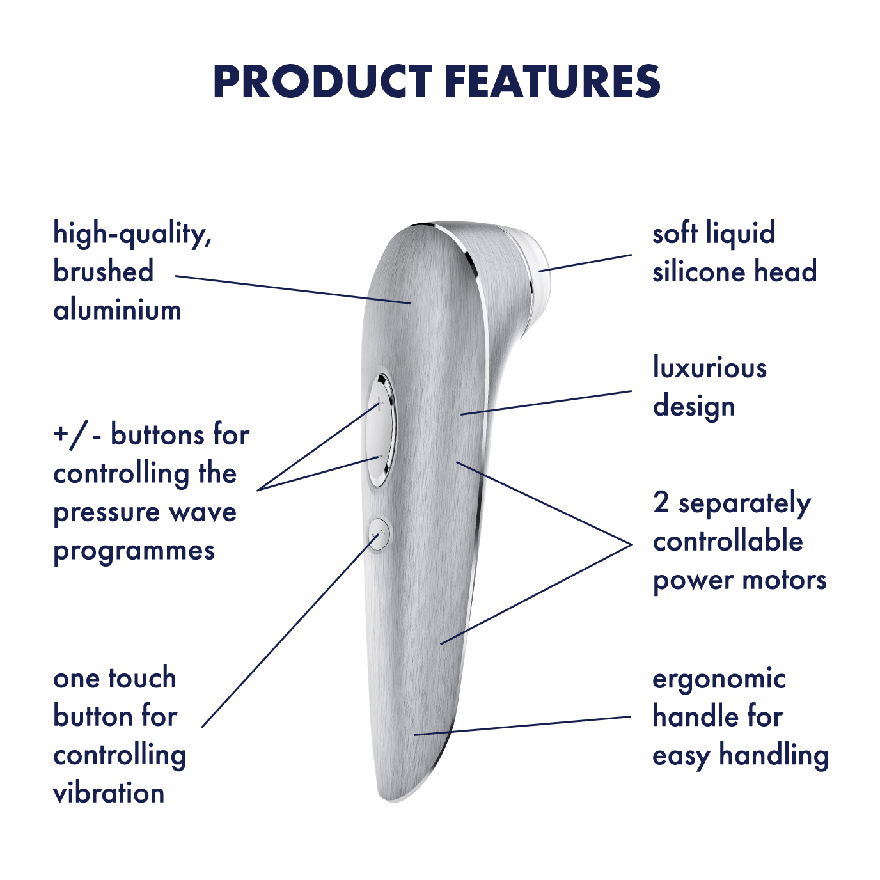 Лакшери-дизайн плюс отличная функциональность — все это сочетается в новой модели вакуумного стимулятора. Во-первых, роскошный корпус из сатинированного алюминия выглядит стильно, дорого и современно, к тому же, на нем не остаются следы от пальцев. Во-вторых, очень мягкая силиконовая накладка делает процесс еще более приятным и комфортным. И, в-третьих, это конечно вакуумная стимуляция, имитирующая нежные (или более интенсивные — это как вы настроите) посасывания клитора, которую удачно дополняет регулируемая вибрация. Причем, управлять вакуумом и вибрацией можно по отдельности, подбирая идеальный именно для вас режим.